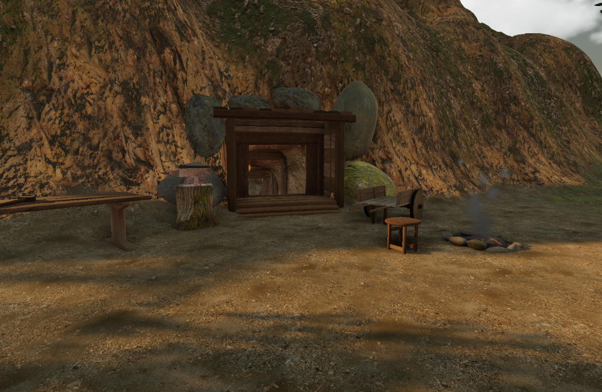 Další novinkou je možnost založit oheň. Tato mechanika ještě není úplně hotová, protože je k ní potřeba inventář, ale momentálně u hornického dolu se nachází ohniště.