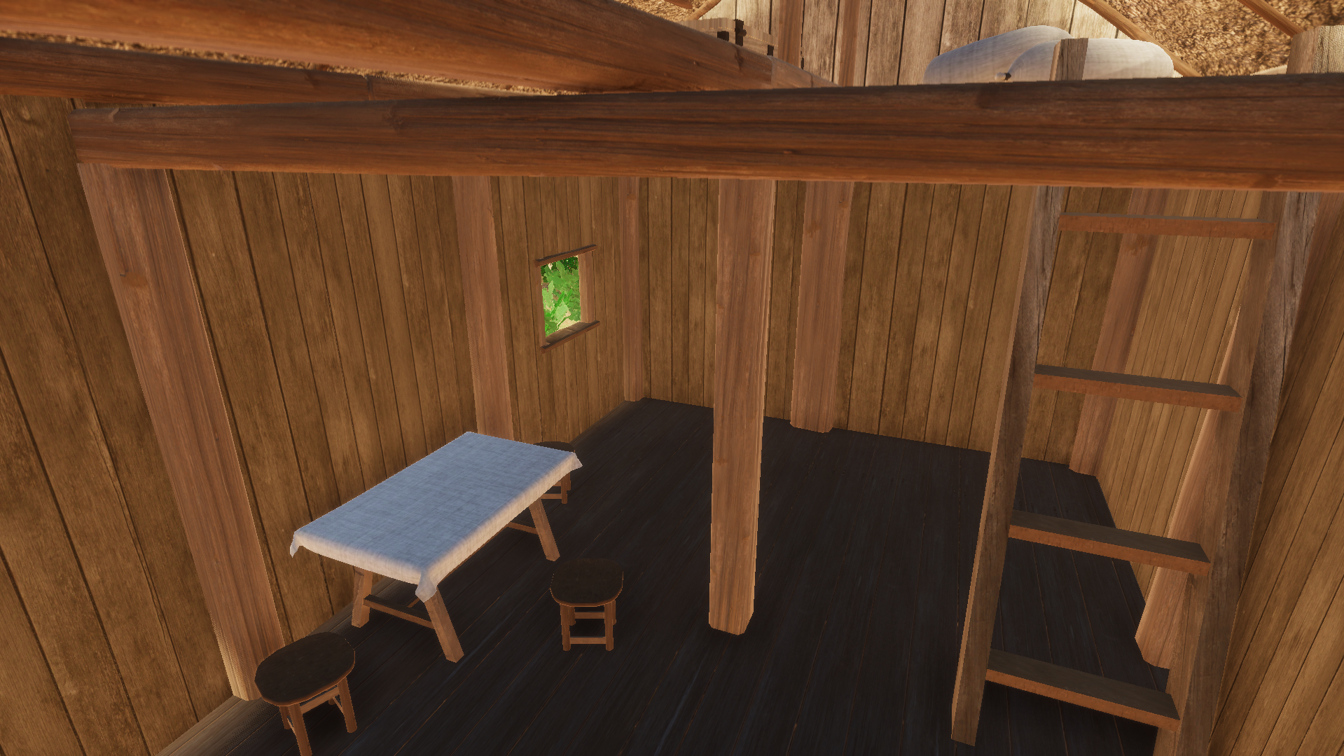 Jedním z baráků je dřevorubecký post, kde se vedle budovy nachází sklad dřeva, nářadí a další detaily